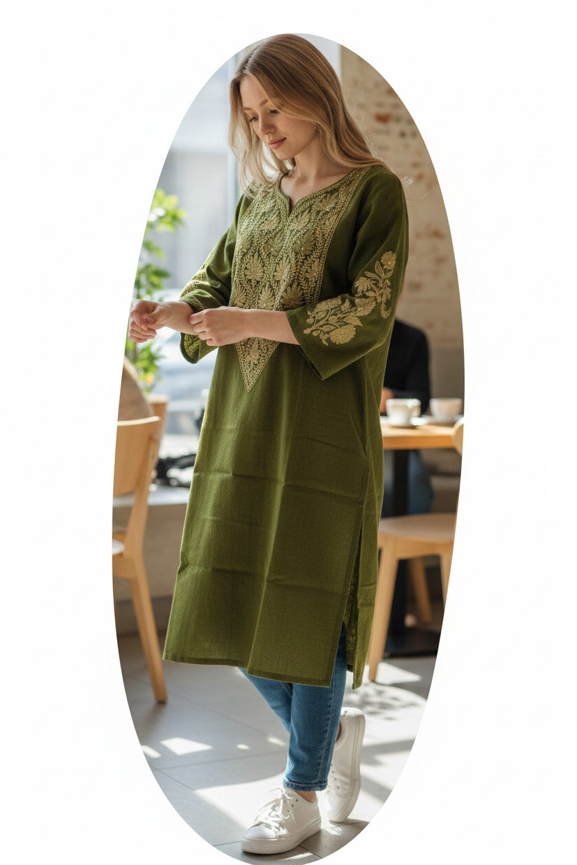 A gorgeous woolen women Kurtis in the beauty of Aari Embroidery of...