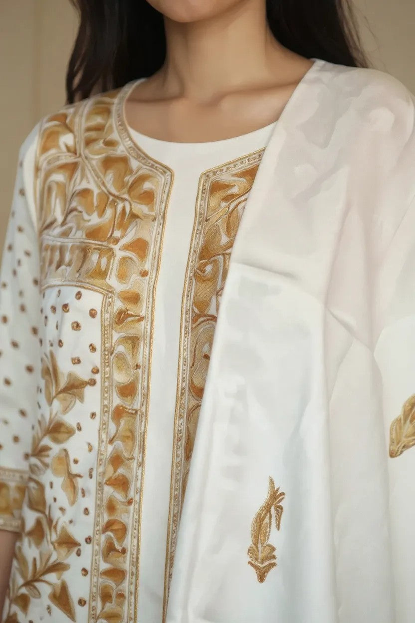 This beautifully handcrafted dress material by Kashmir Gallery will make you star of the parties and family functions. It can be presented as a gift on special occasions like wedding anniversary, birthdays etc. It features beautiful embroidery from the neck to bottom. Some part of embroidery is also at the bottom front of the salwar. It's made of 100% wool and Aari Embroidery by best artisans of the valley.