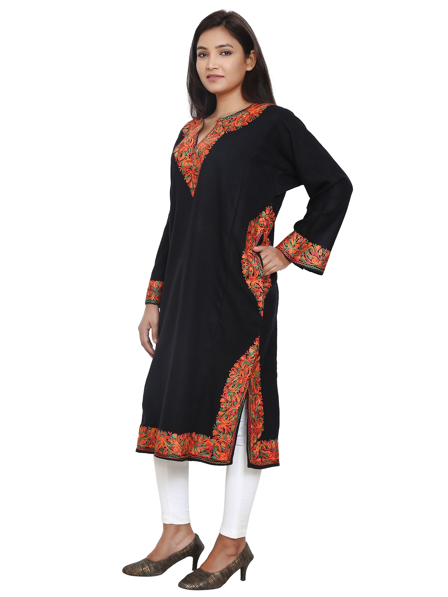 A gorgeous woolen women Kurtis in the beauty of Aari Embroidery of Kashmir. In enchanting l vine pattern, the aari kari on this Pheran is a stunning artwork reflecting the timeless beauty of Kashmir.
