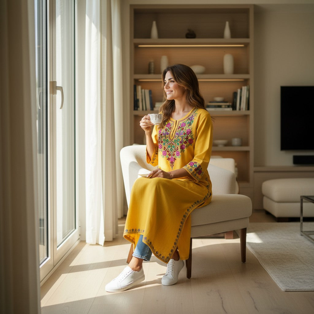 Kashmiri Woolen Pheran with Traditional Embroidery - Mustard