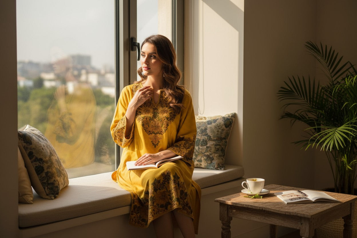Kashmiri Woolen Pheran with Traditional Embroidery - Mustard