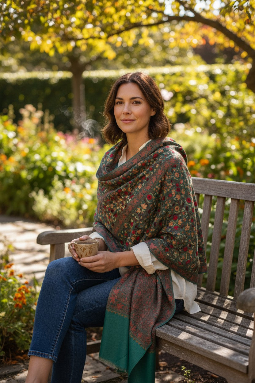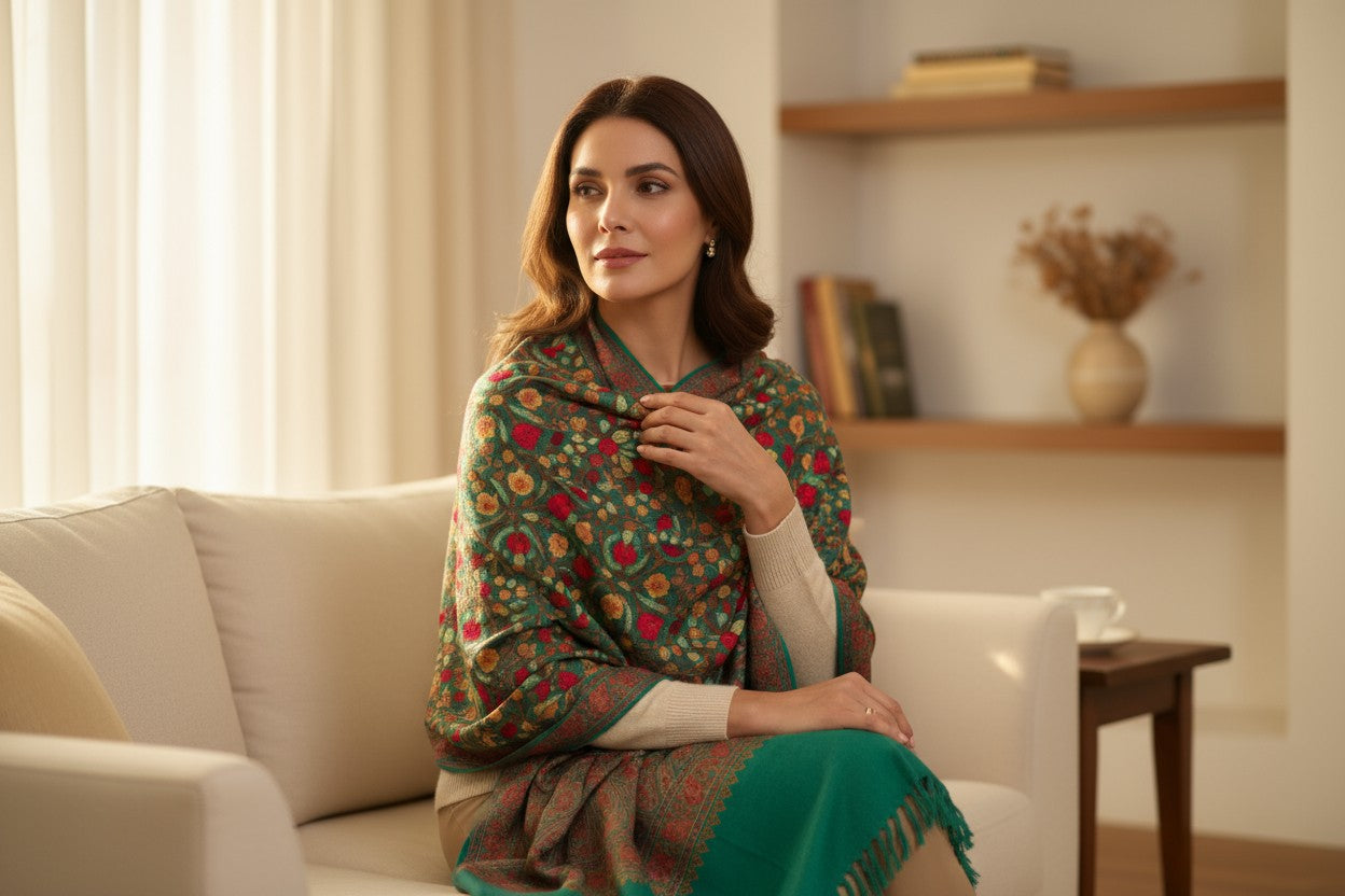 Kashmiri Woolen Stole with Aari Embroidery | Elegant Winter Wrap | Traditional Ethnic Wear for Women - Green