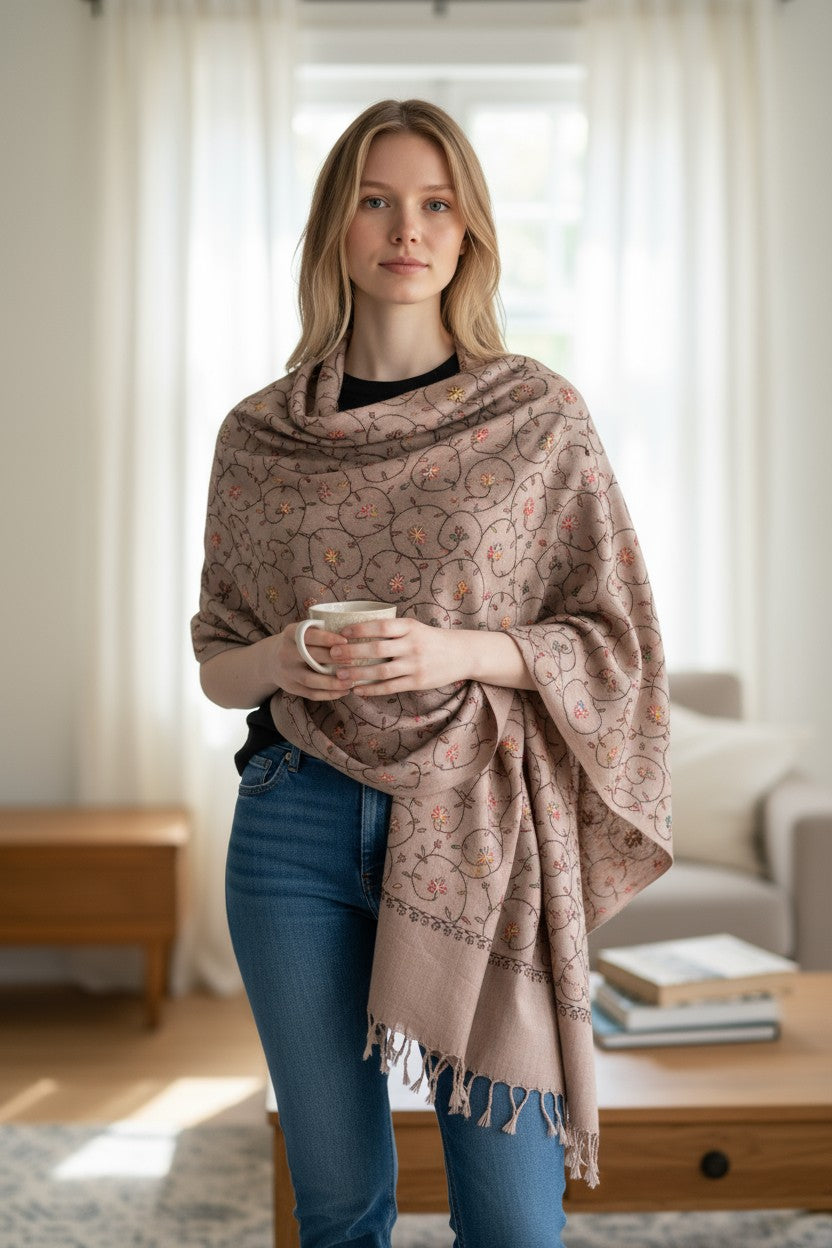Kashmiri Woolen Stole with Aari Embroidery | Elegant Winter Wrap | Traditional Ethnic Wear for Women - Grey