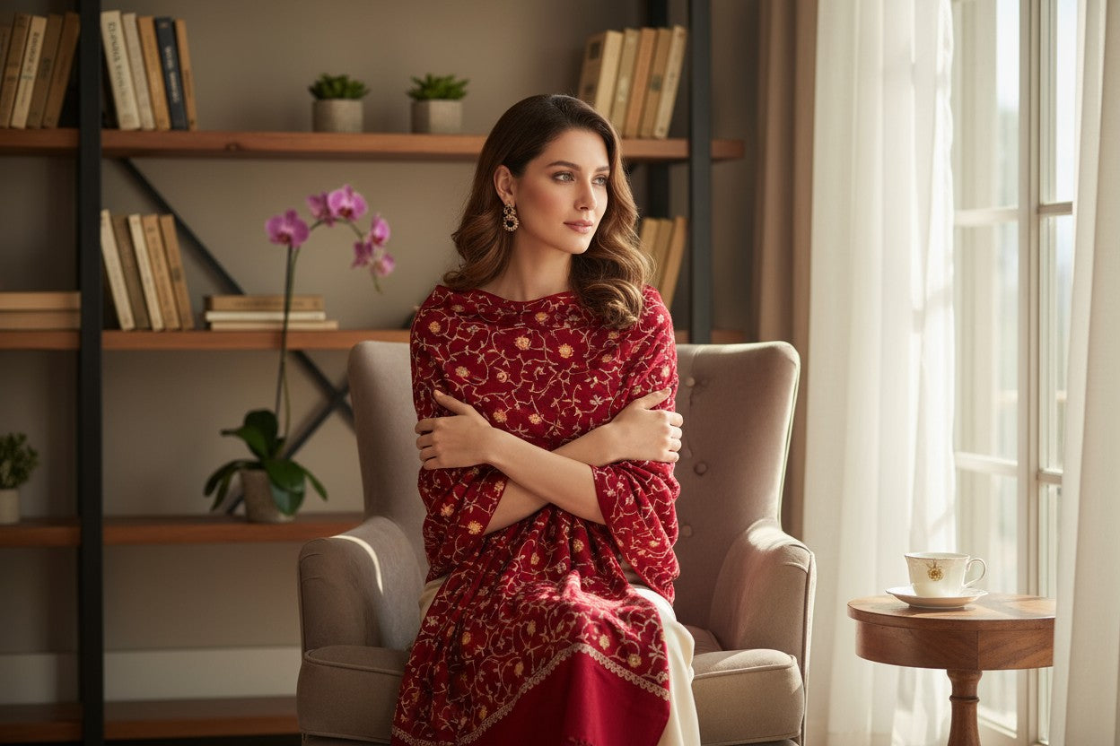 Kashmiri Woolen Stole with Aari Embroidery | Elegant Winter Wrap | Traditional Ethnic Wear for Women - Maroon