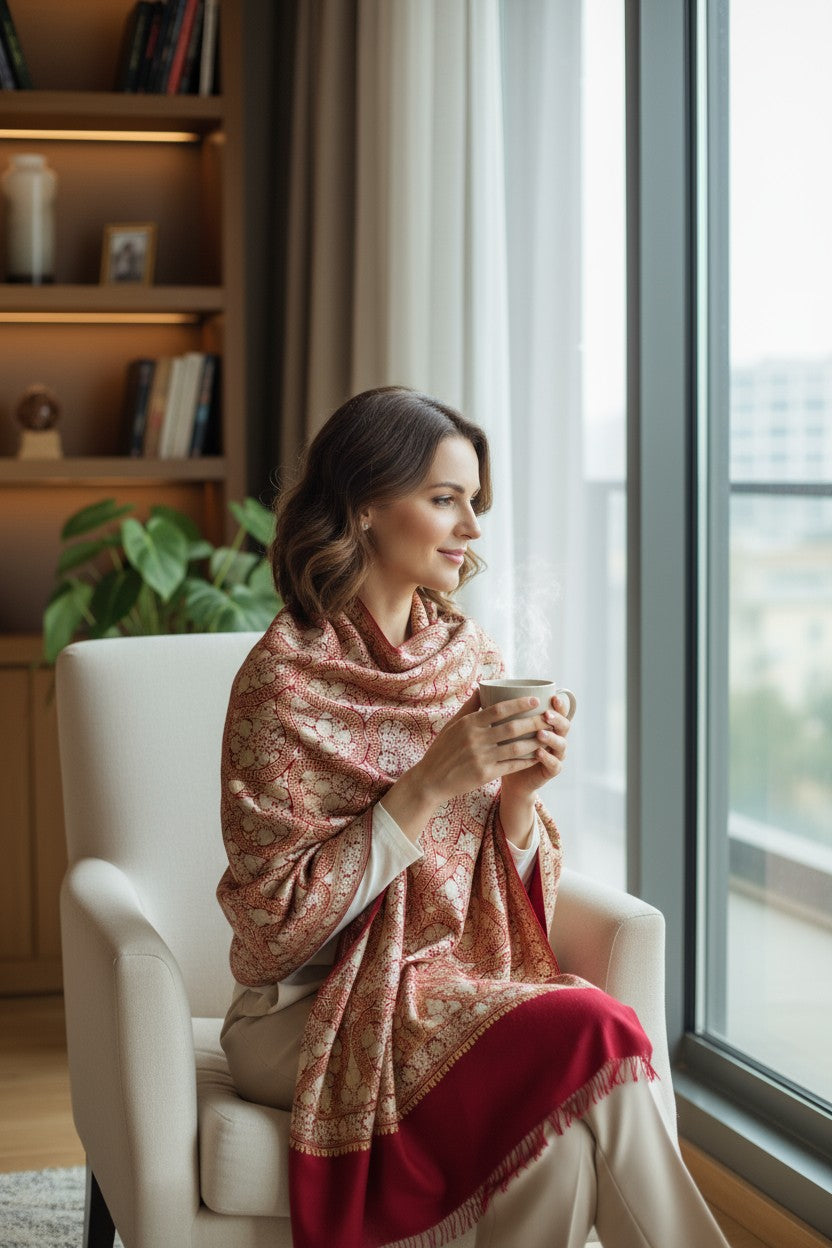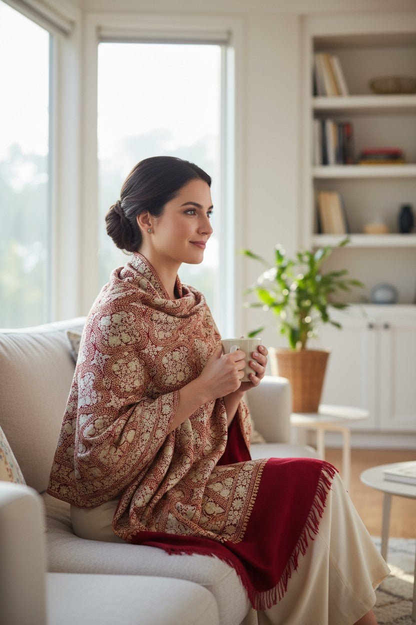 Kashmiri Woolen Stole with Aari Embroidery | Elegant Winter Wrap | Traditional Ethnic Wear for Women - Maroon