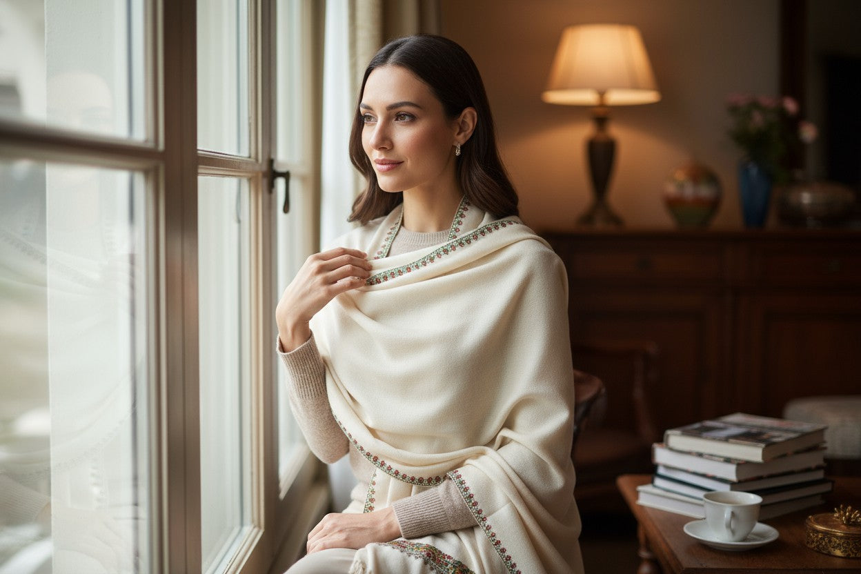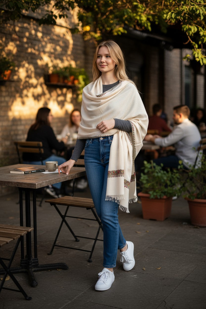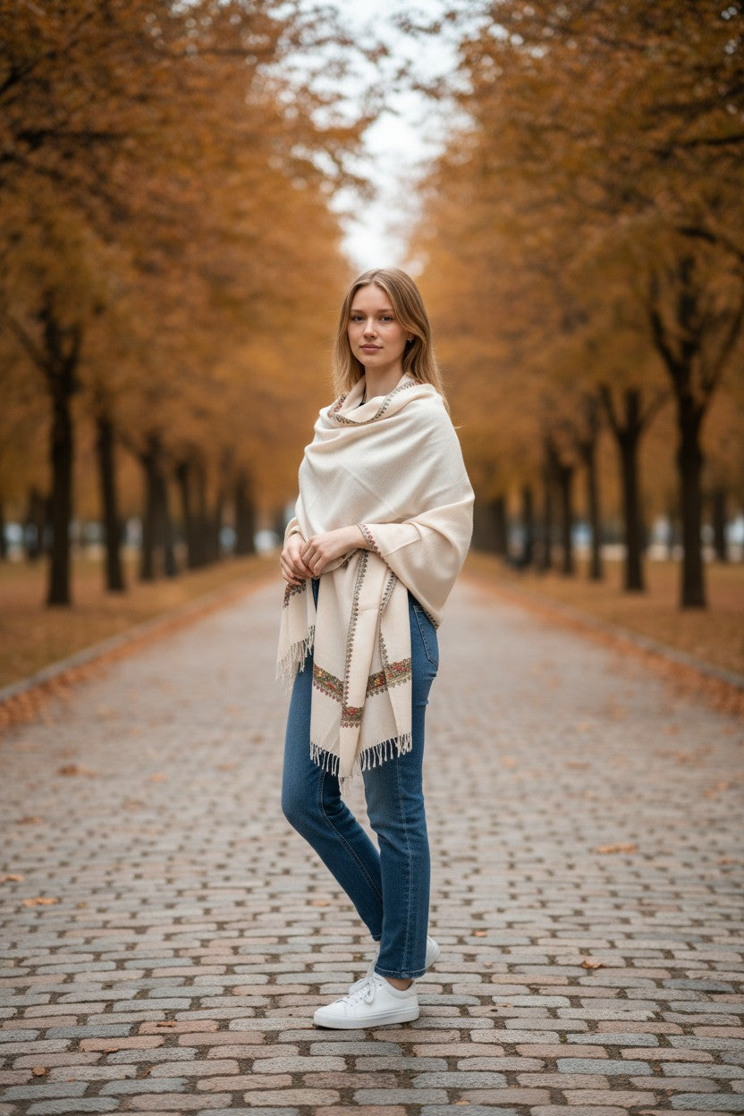 Kashmiri Woolen Stole with Aari Embroidery | Elegant Winter Wrap | Traditional Ethnic Wear for Women - White