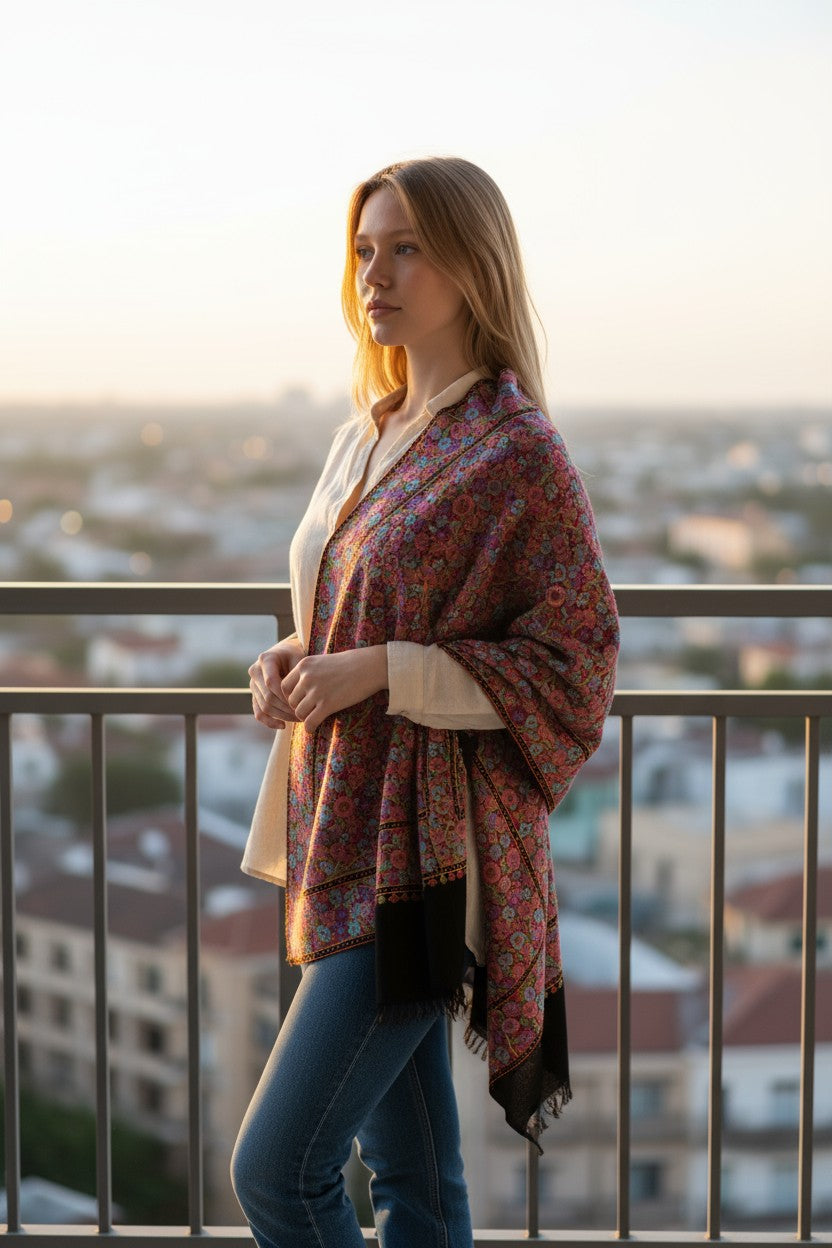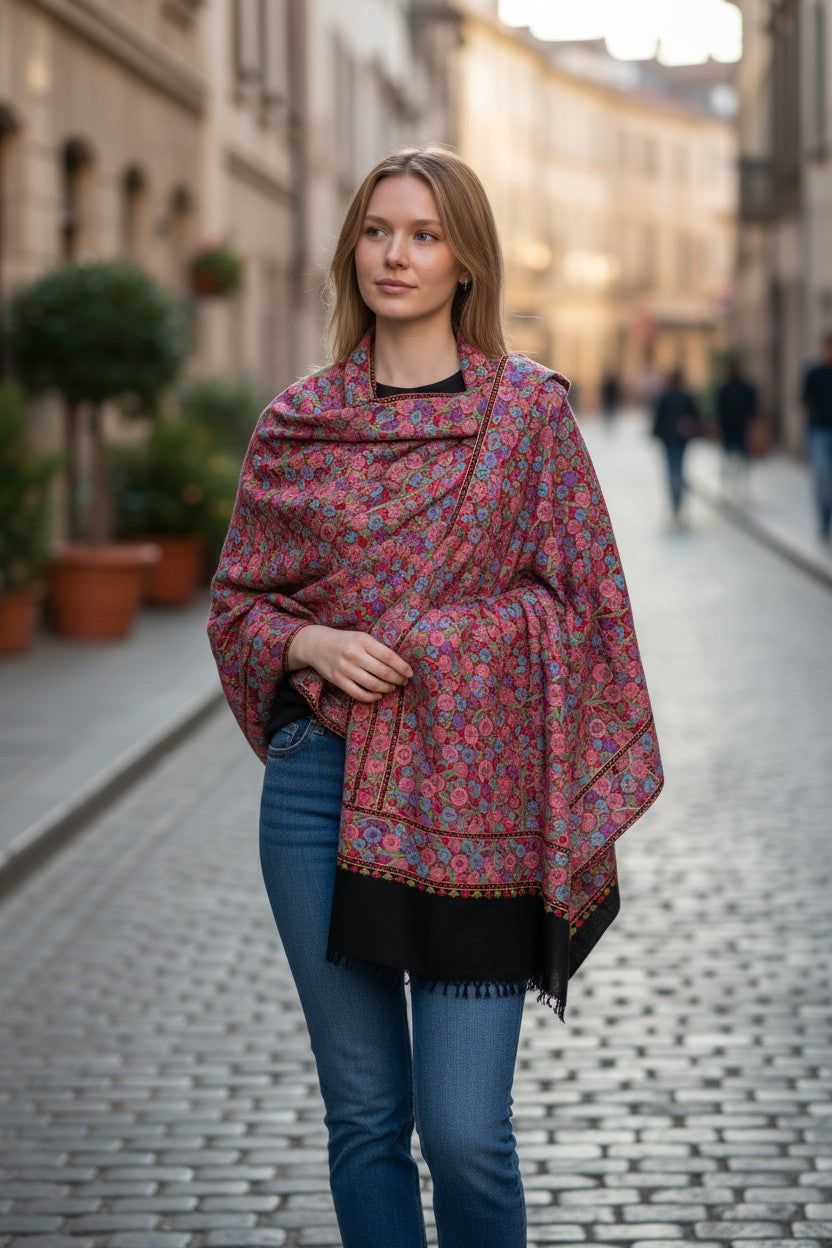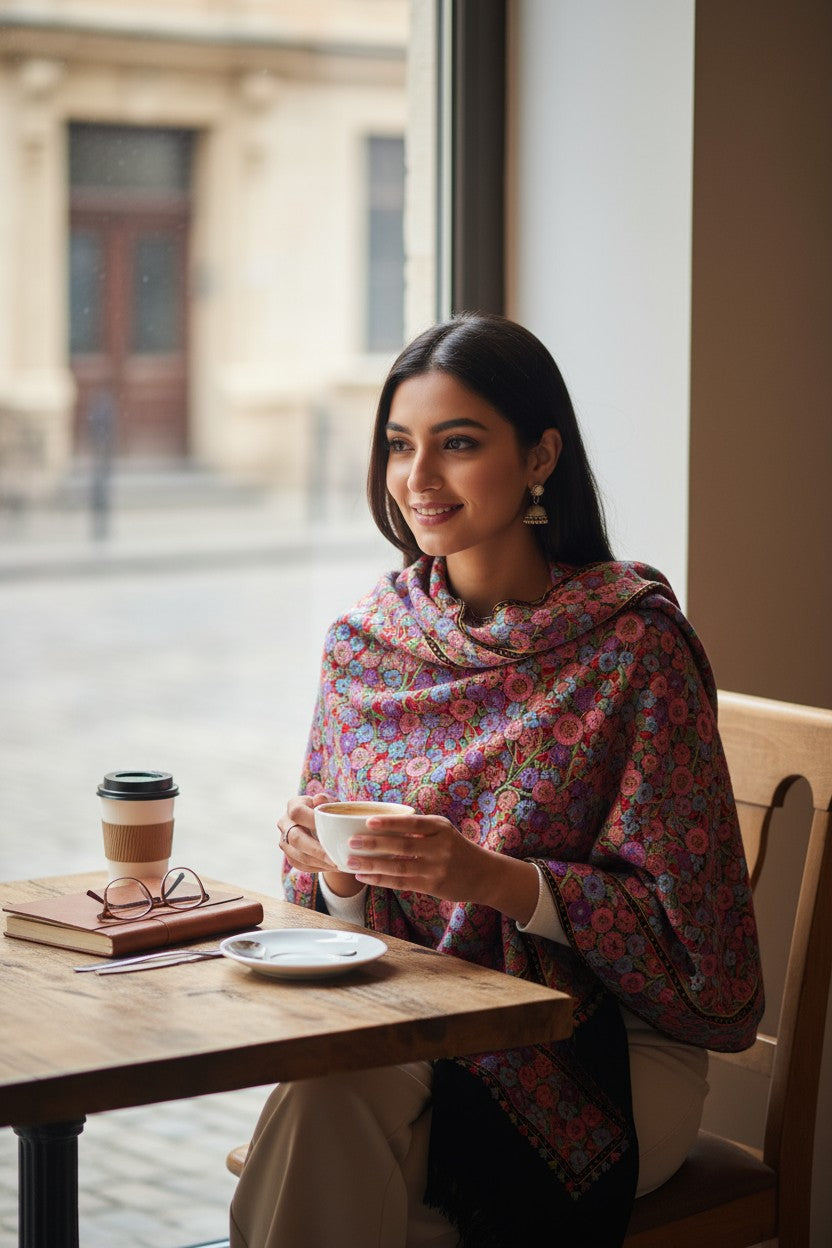 Kashmiri Woolen Stole with Sozni Embroidery | Elegant Winter Wrap | Traditional Ethnic Wear for Women - Black
