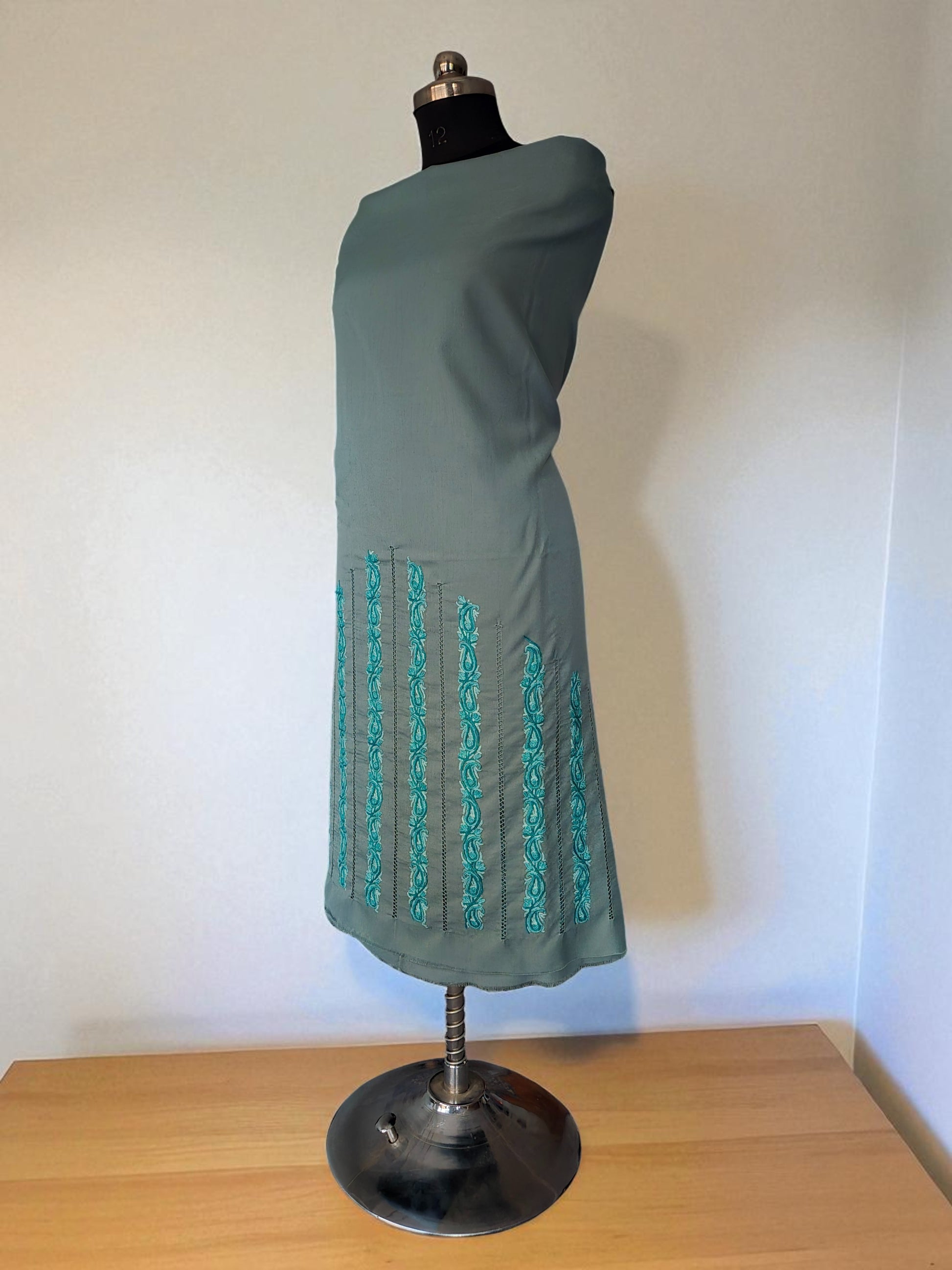 Experience the timeless elegance of Kashmiri craftsmanship with this exquisite 2-piece suit set featuring traditional Aari hand embroidery. Meticulously hand worked by skilled artisans of Kashmir, the suit showcases intricate floral and paisley motifs that are signature to Kashmiri design.