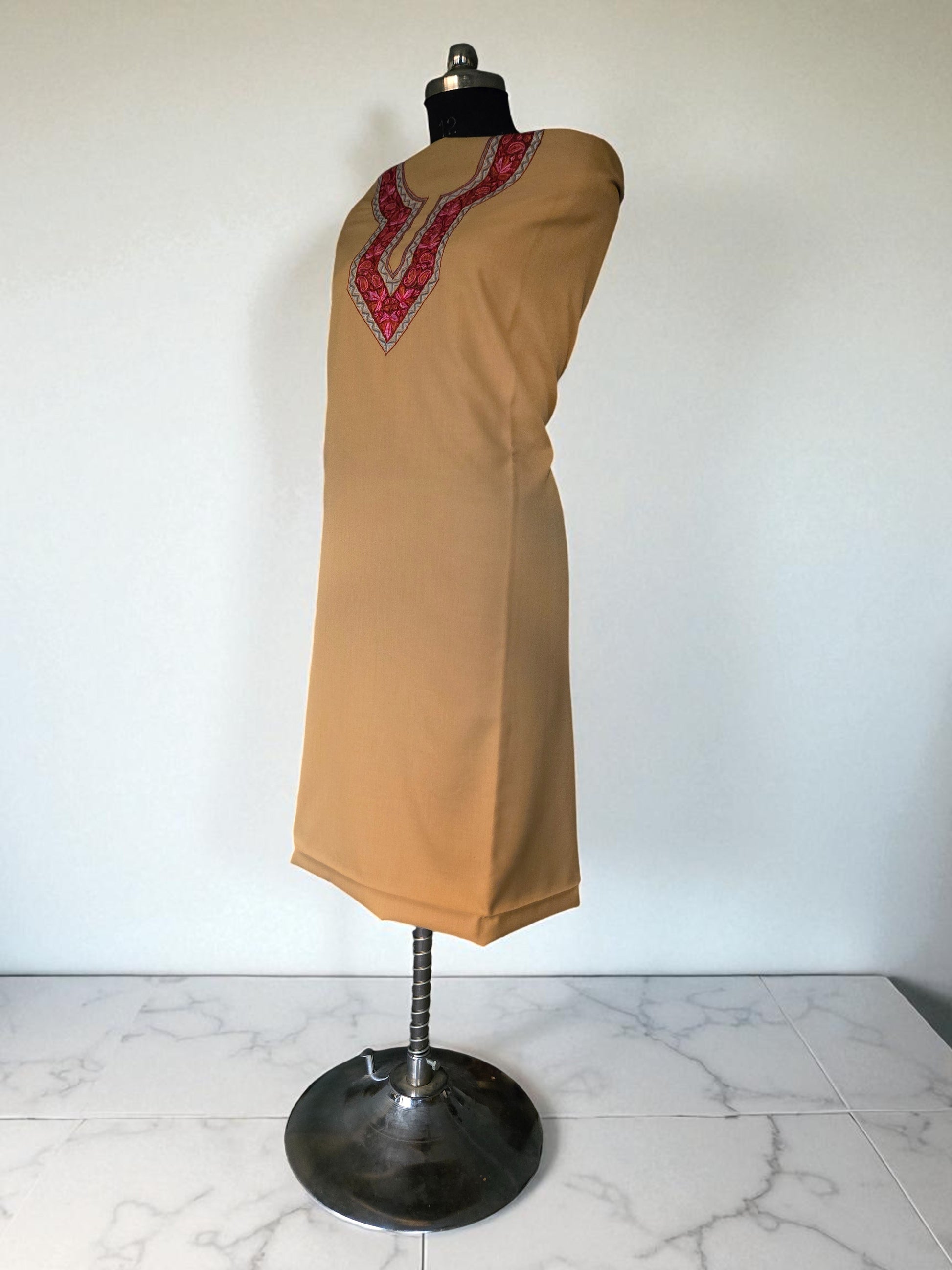 Experience the timeless elegance of Kashmiri craftsmanship with this exquisite 2-piece suit set featuring traditional Aari hand embroidery. Meticulously hand worked by skilled artisans of Kashmir, the suit showcases intricate floral and paisley motifs that are signature to Kashmiri design.