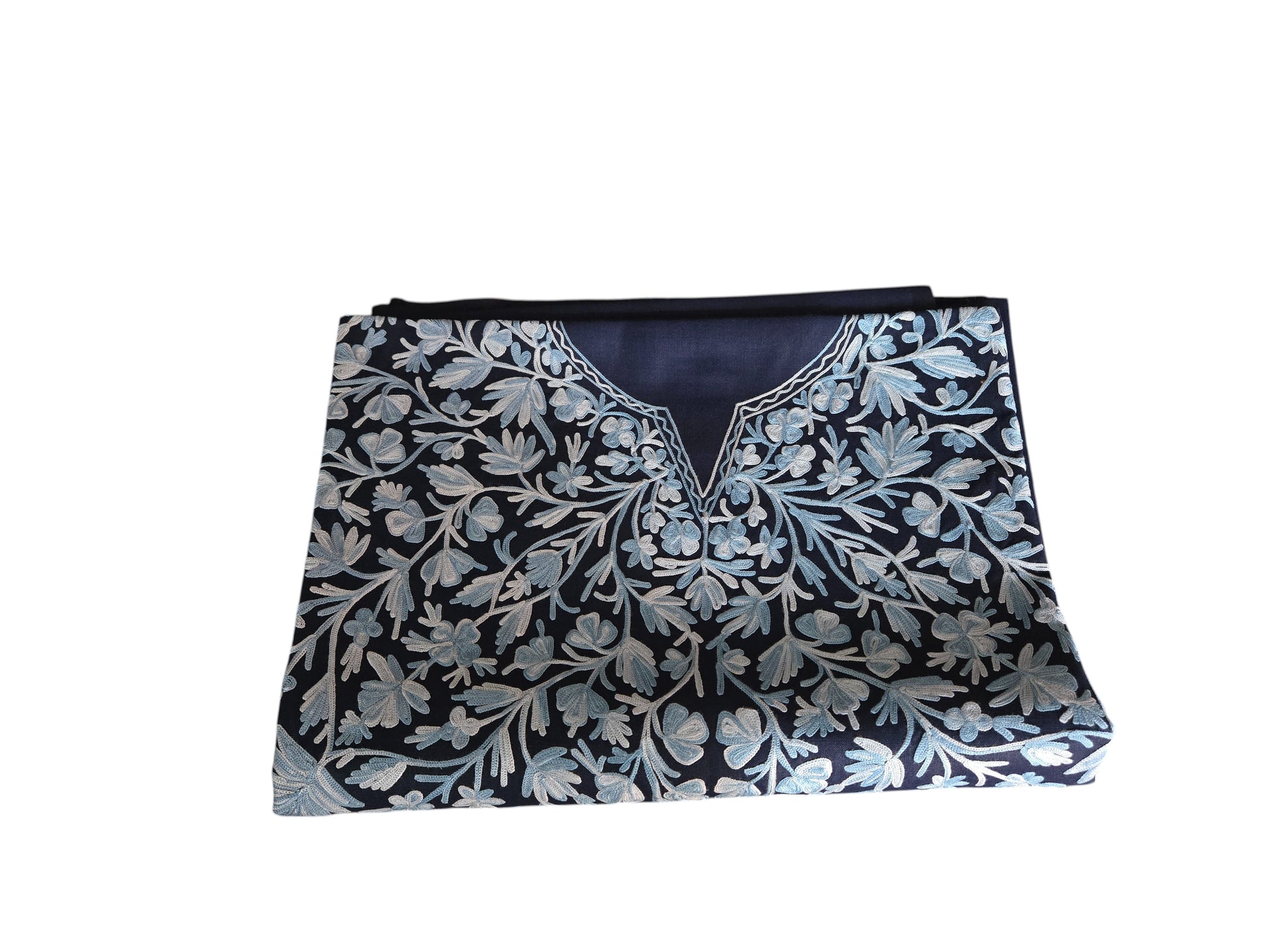 Experience the timeless elegance of Kashmiri craftsmanship with this exquisite 2-piece suit set featuring traditional aari embroidery. Meticulously hand worked by skilled artisans of Kashmir, the suit showcases intricate floral and paisley motifs that are signature to Kashmiri design.