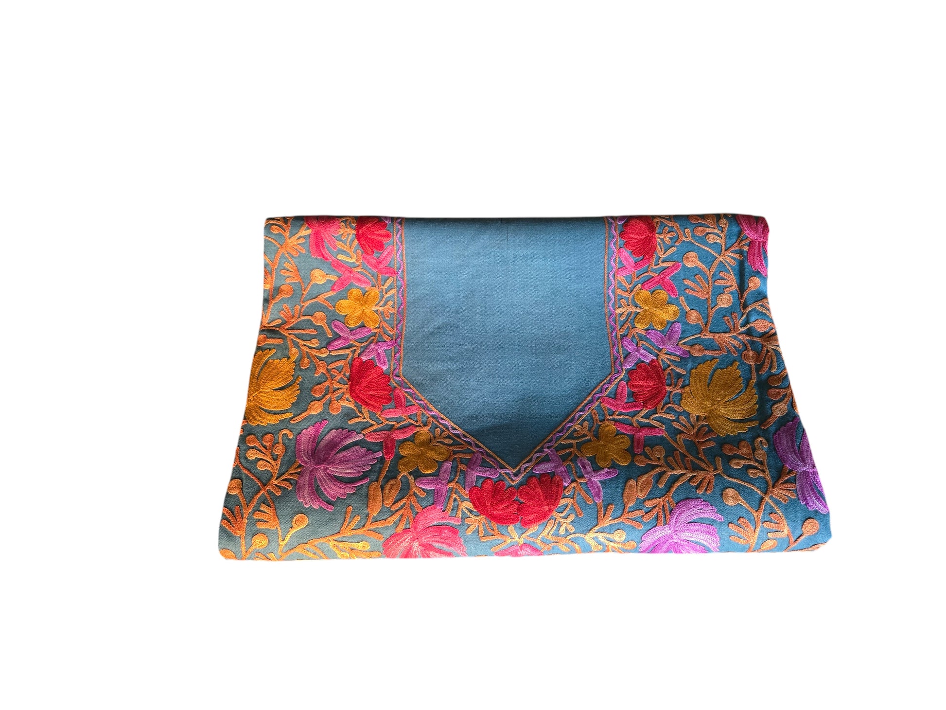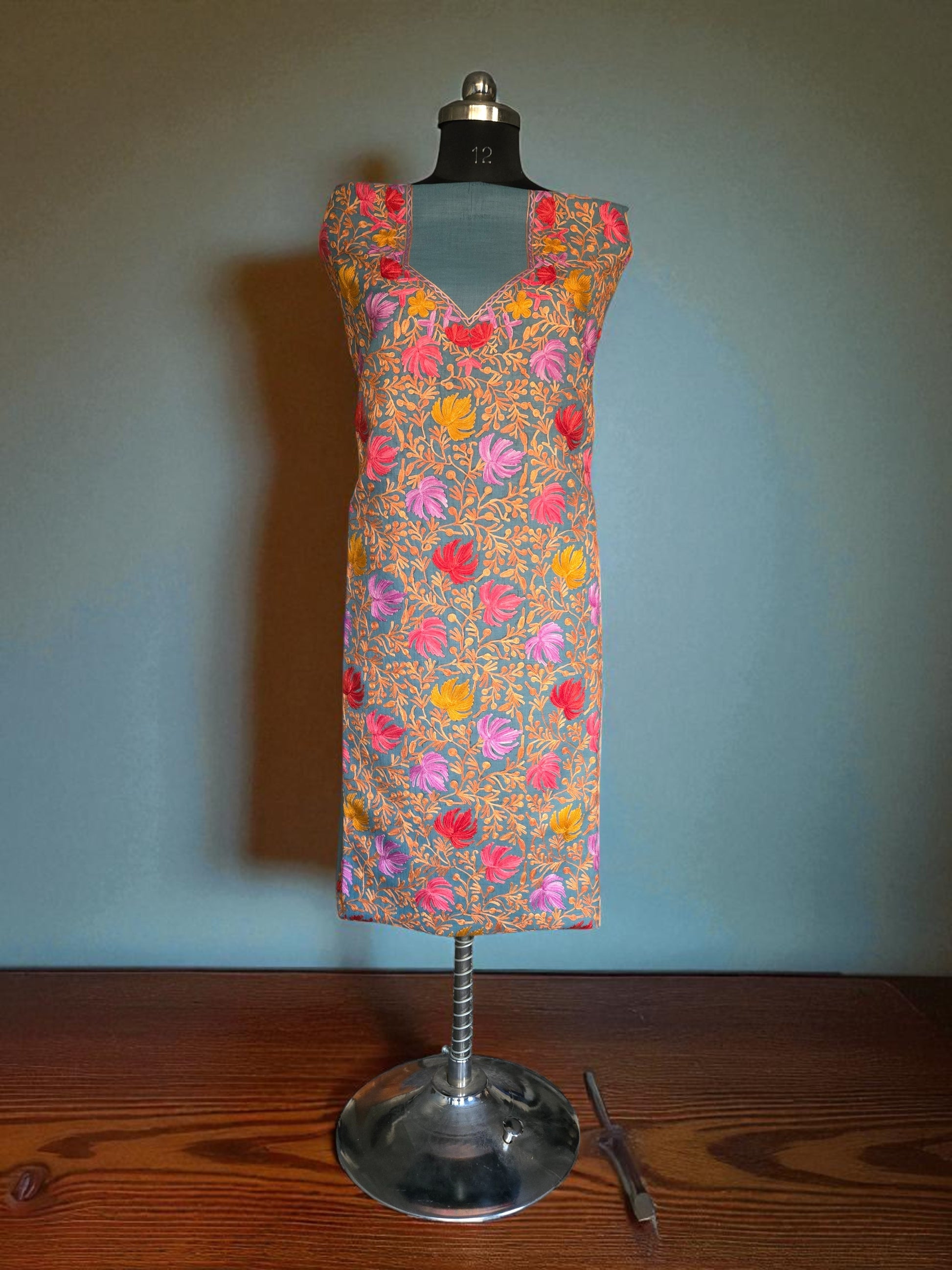 Experience the timeless elegance of Kashmiri craftsmanship with this exquisite 2-piece suit set featuring traditional aari embroidery. Meticulously hand worked by skilled artisans of Kashmir, the suit showcases intricate floral and paisley motifs that are signature to Kashmiri design.