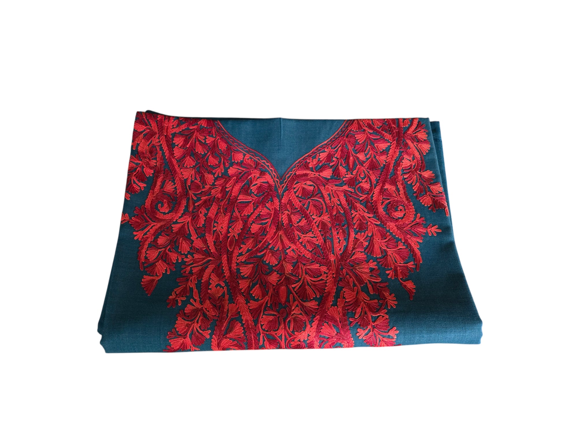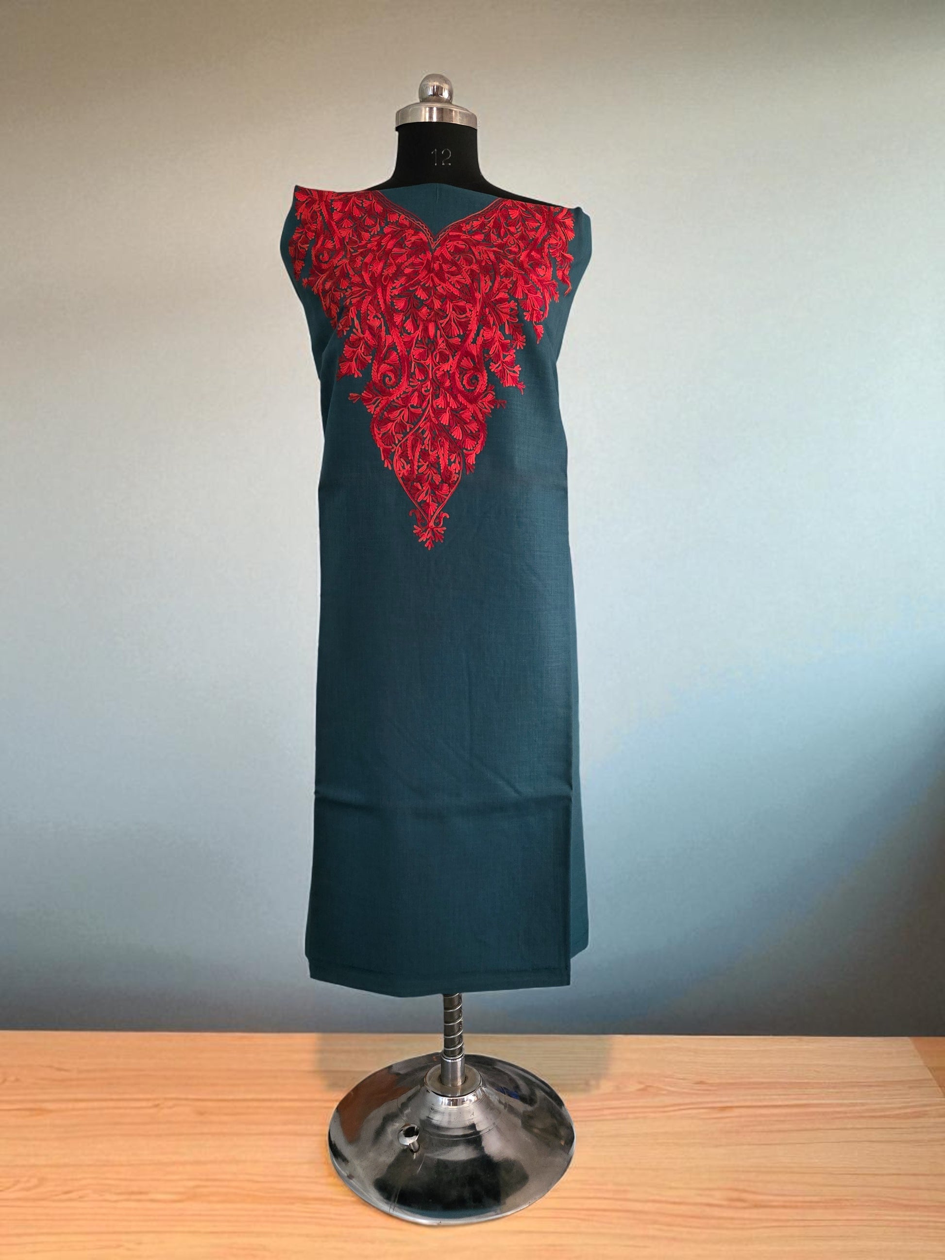 Experience the timeless elegance of Kashmiri craftsmanship with this exquisite 2-piece suit set featuring traditional aari embroidery. Meticulously hand worked by skilled artisans of Kashmir, the suit showcases intricate floral and paisley motifs that are signature to Kashmiri design.
