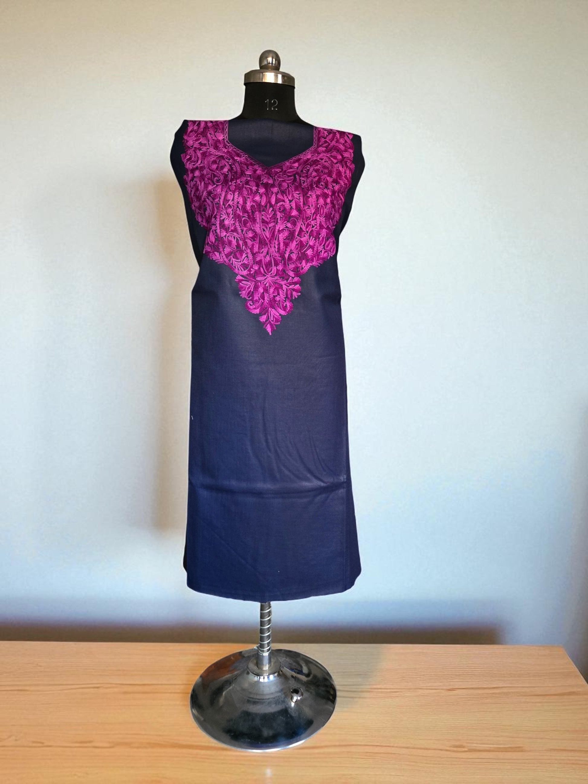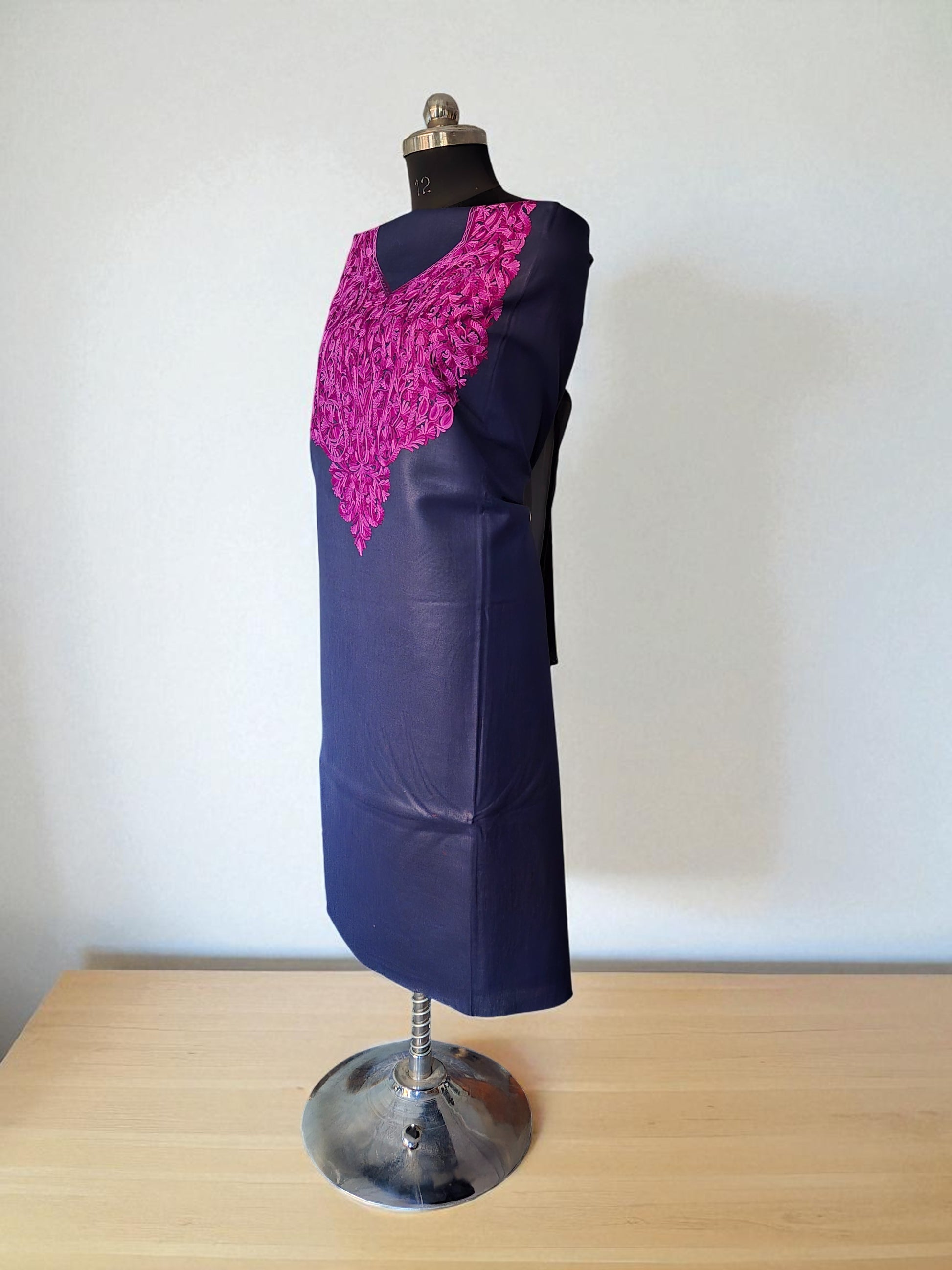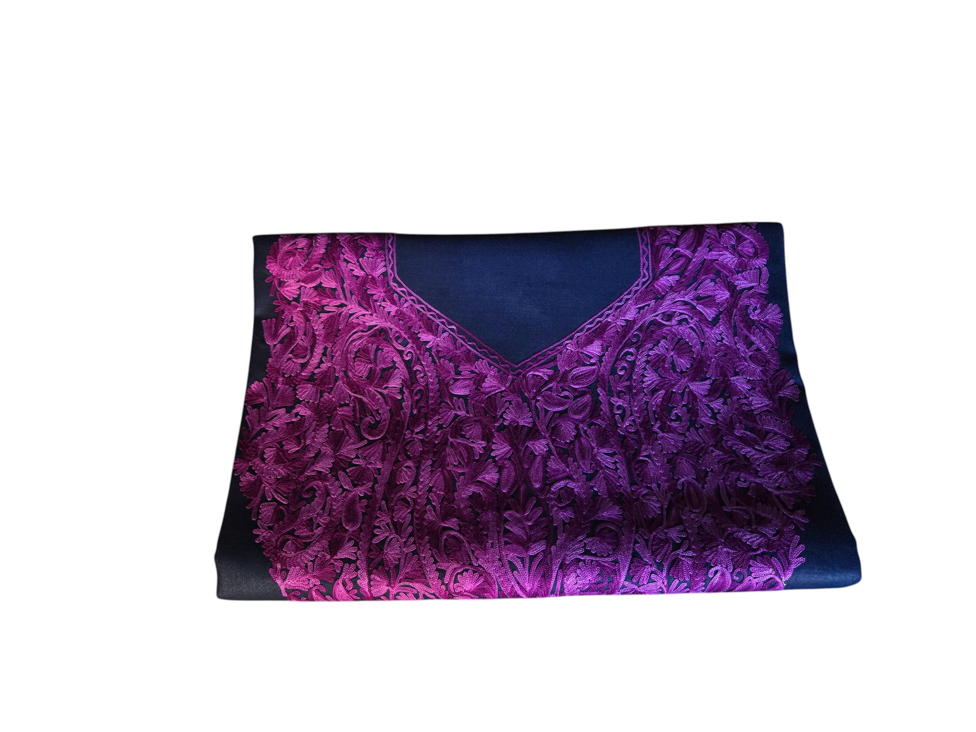 Experience the timeless elegance of Kashmiri craftsmanship with this exquisite 2-piece suit set featuring traditional aari embroidery. Meticulously hand worked by skilled artisans of Kashmir, the suit showcases intricate floral and paisley motifs that are signature to Kashmiri design.