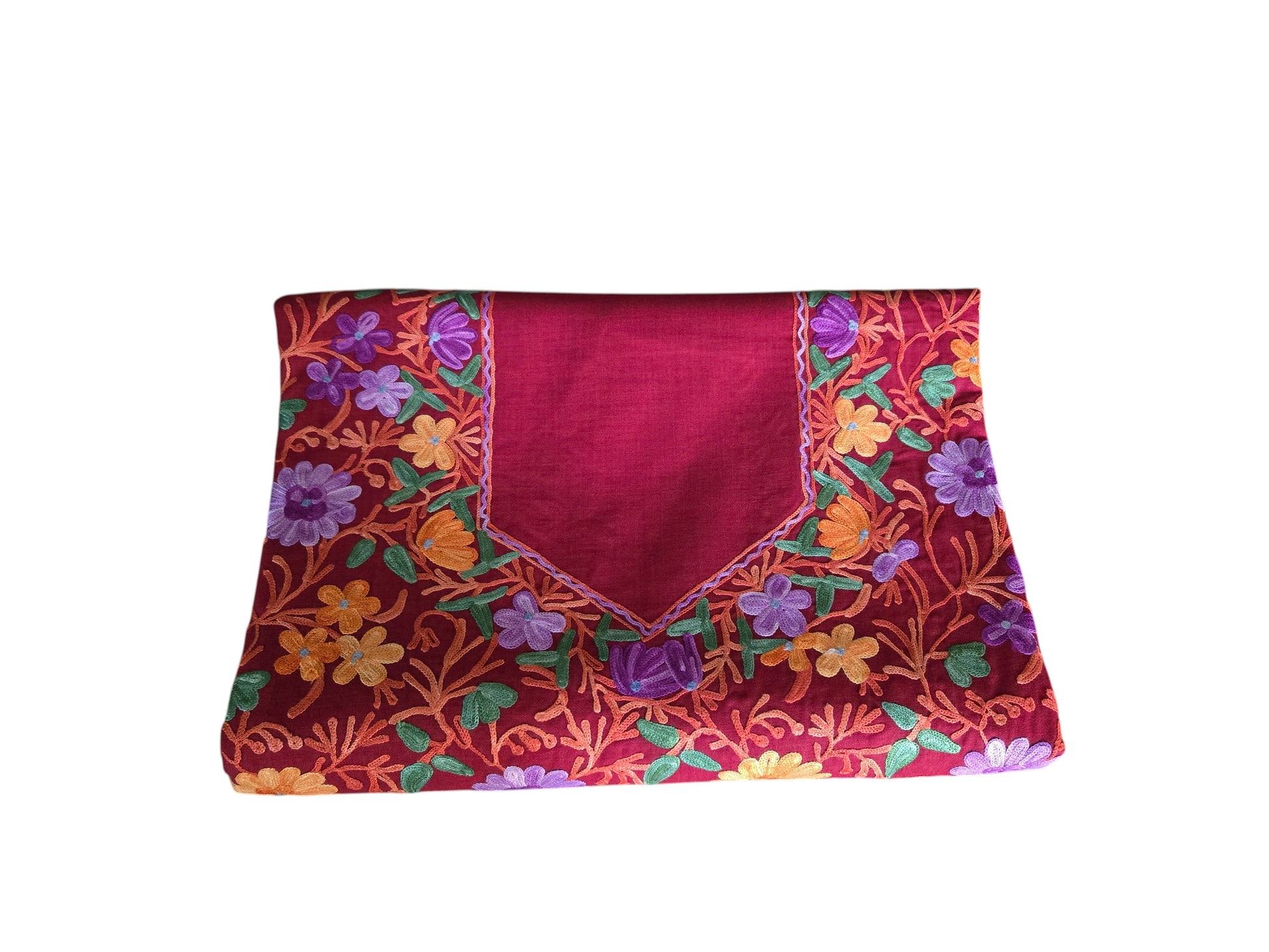 Experience the timeless elegance of Kashmiri craftsmanship with this exquisite 2-piece suit set featuring traditional aari embroidery. Meticulously hand worked by skilled artisans of Kashmir, the suit showcases intricate floral and paisley motifs that are signature to Kashmiri design.