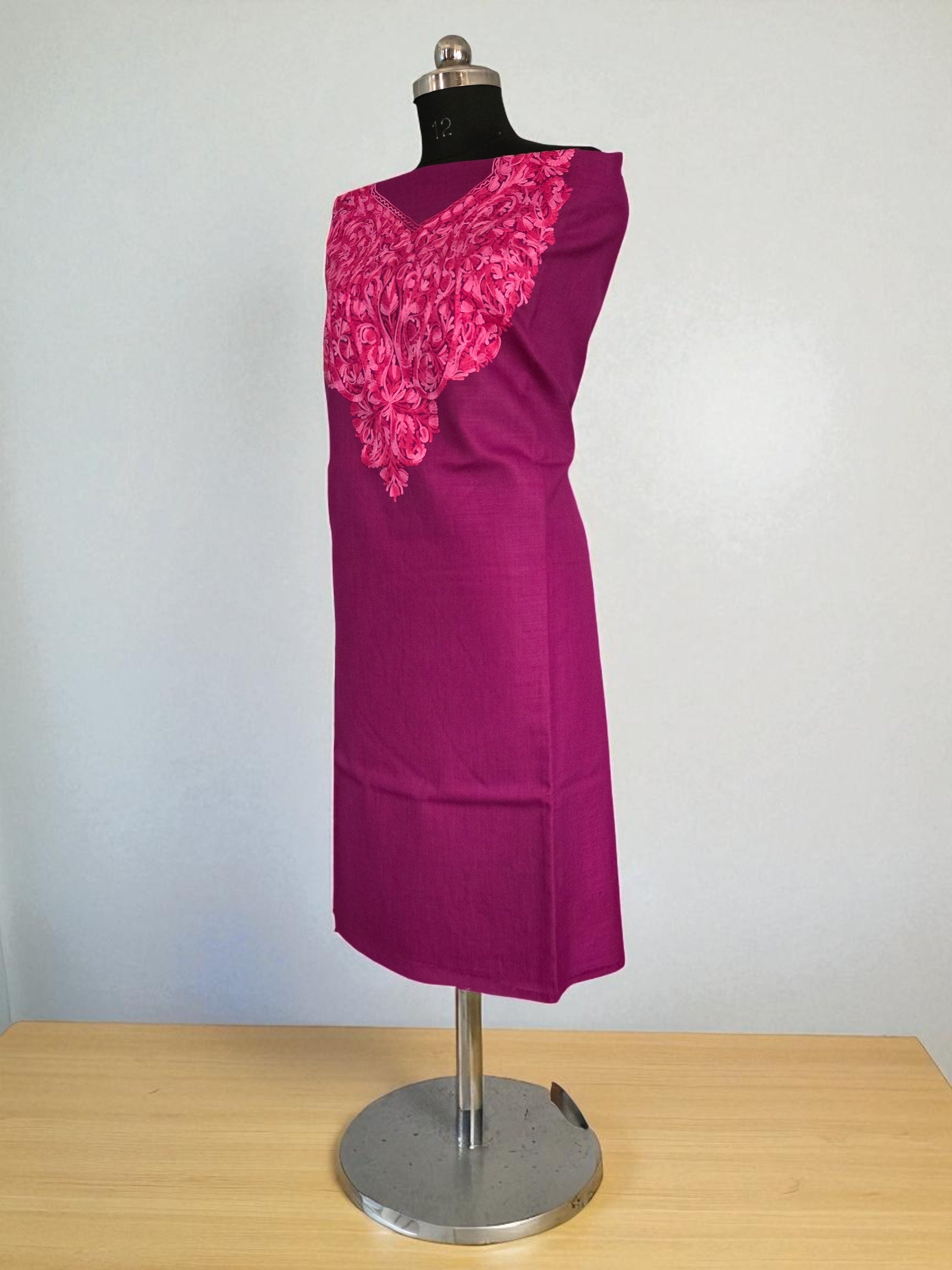 Experience the timeless elegance of Kashmiri craftsmanship with this exquisite 2-piece suit set featuring traditional aari embroidery. Meticulously hand worked by skilled artisans of Kashmir, the suit showcases intricate floral and paisley motifs that are signature to Kashmiri design.
