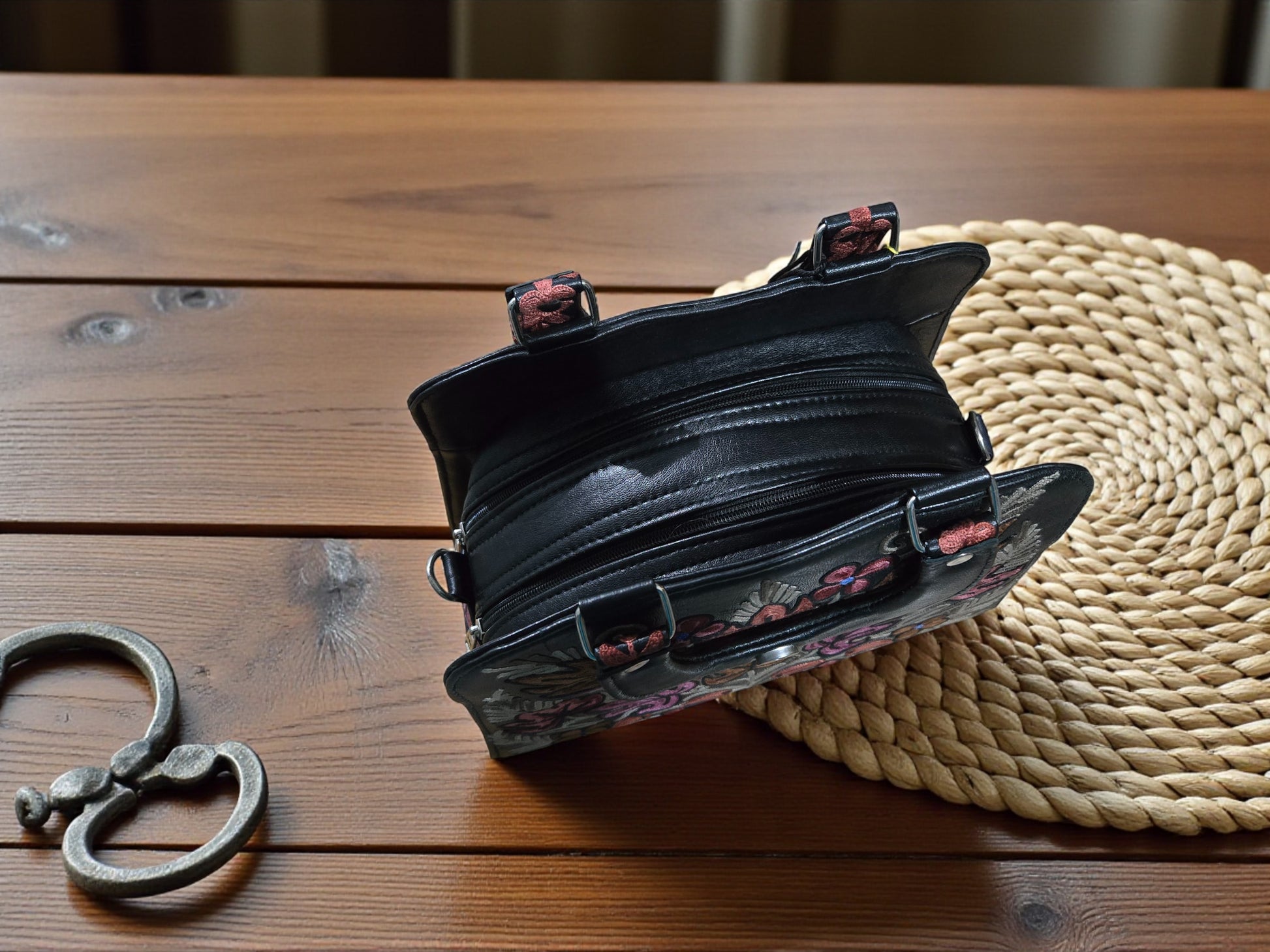 Women Leather Bag With Strap With Gorgeous Kashmiri Embroidery - Black