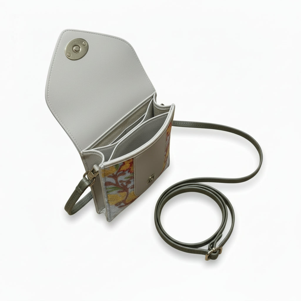A handcrafted PU leather sling passport bag with traditional Kashmiri embroidery — roomy, refined, and made to age beautifully.