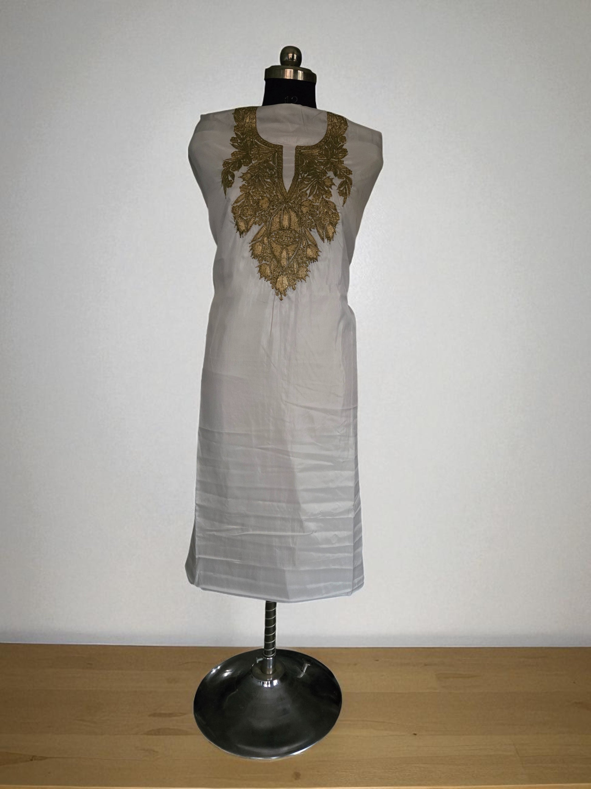 Top (Kurta): Soft, breathable fabric (Silk) adorned with fine Aari embroidery on the neckline, sleeves, and borders.