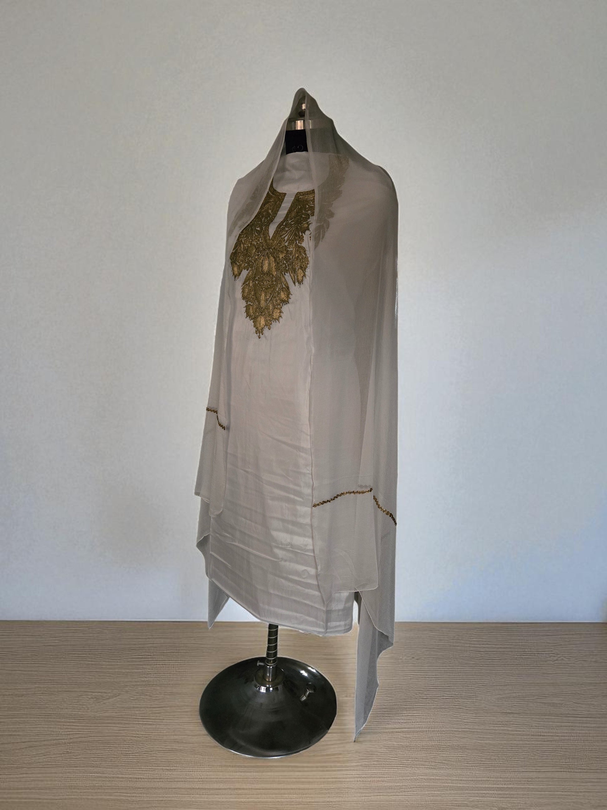 Experience the timeless elegance of Kashmiri craftsmanship with this exquisite 3-piece suit set featuring traditional tilla embroidery. Meticulously handworked by skilled artisans of Kashmir, the suit showcases intricate floral and paisley motifs that are signature to Kashmiri design.