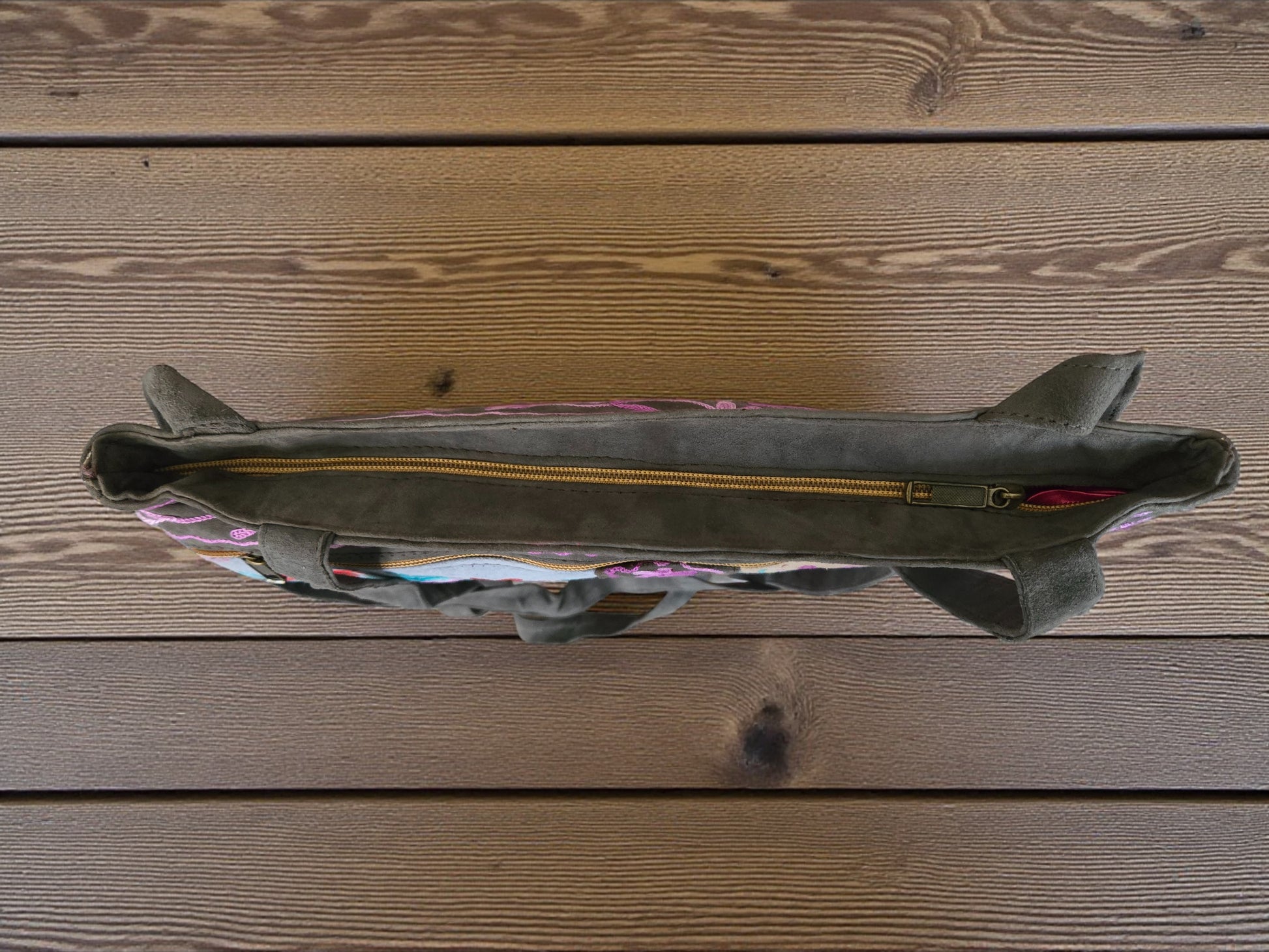 Premium full-grain suede exterior with hand-embroidered Kashmiri motifs