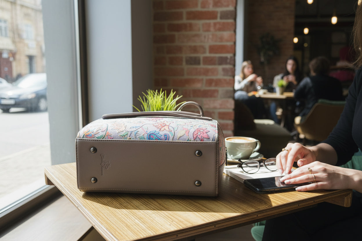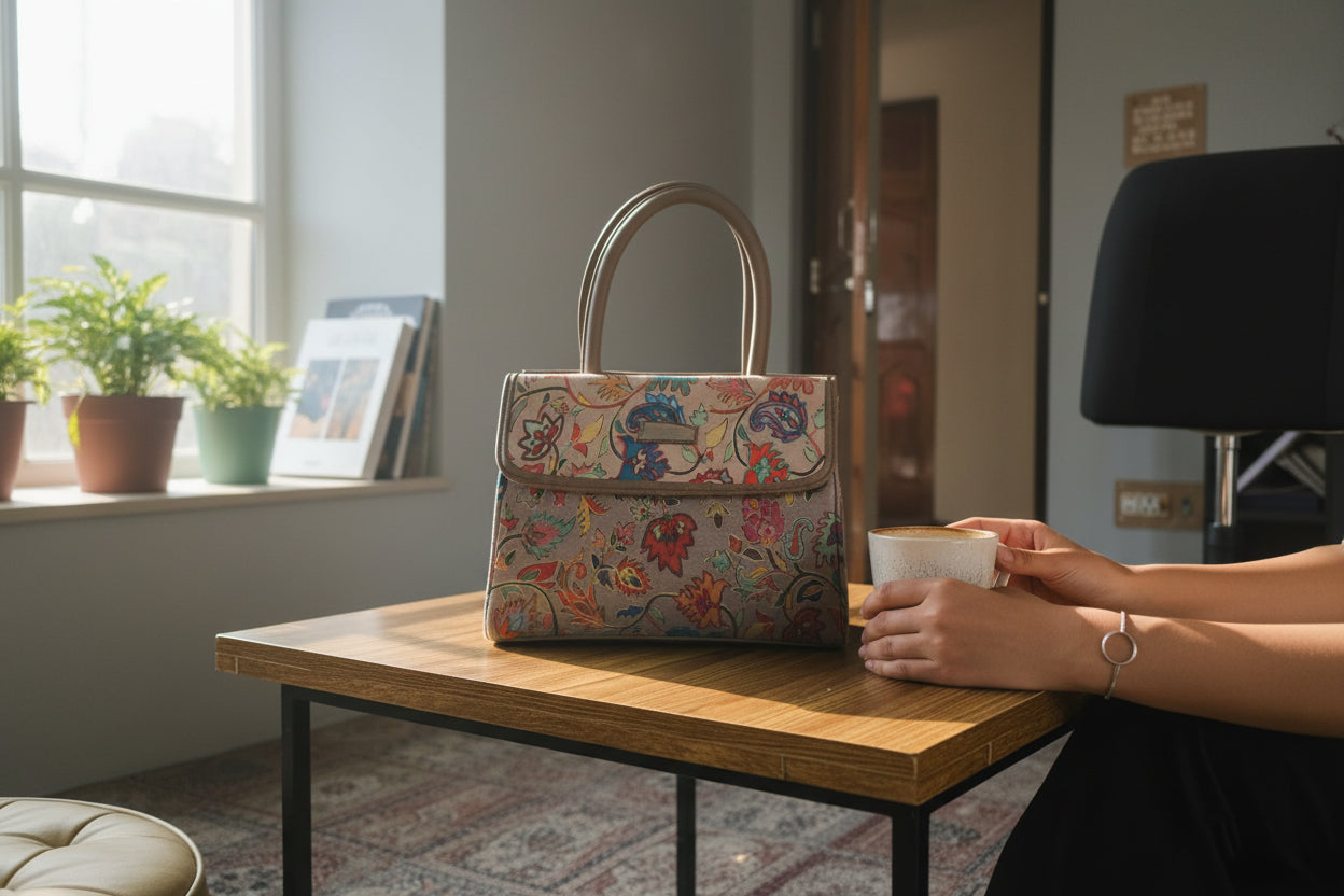A handcrafted suede leather tote detailed with traditional Kashmiri embroidery — roomy, refined, and made to age beautifully.